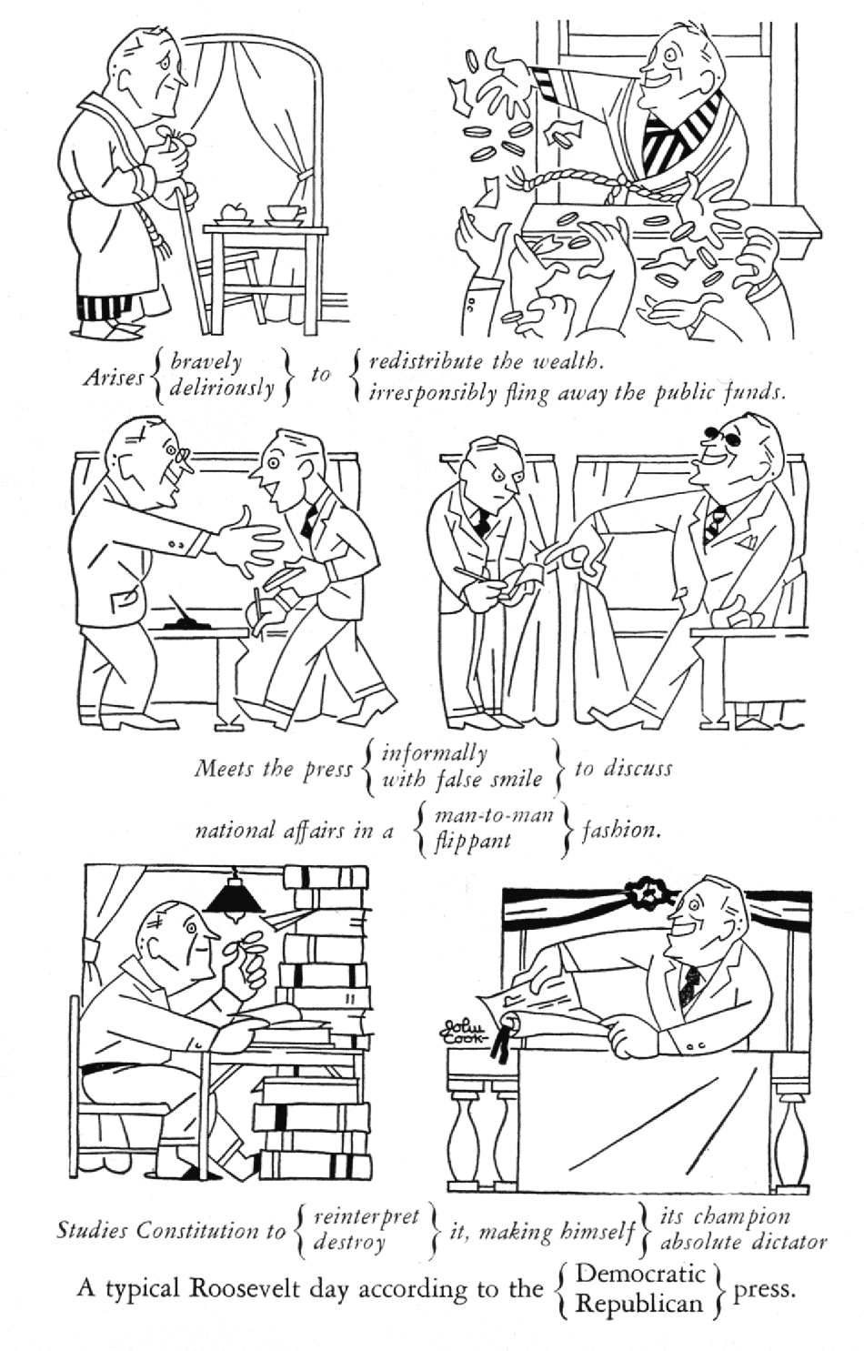 The next cartoon, by John Cook, dates from October of the following year and offers a fine commentary on the partisan press, even as Life itself was switching from one side of the partisan divide to the other.