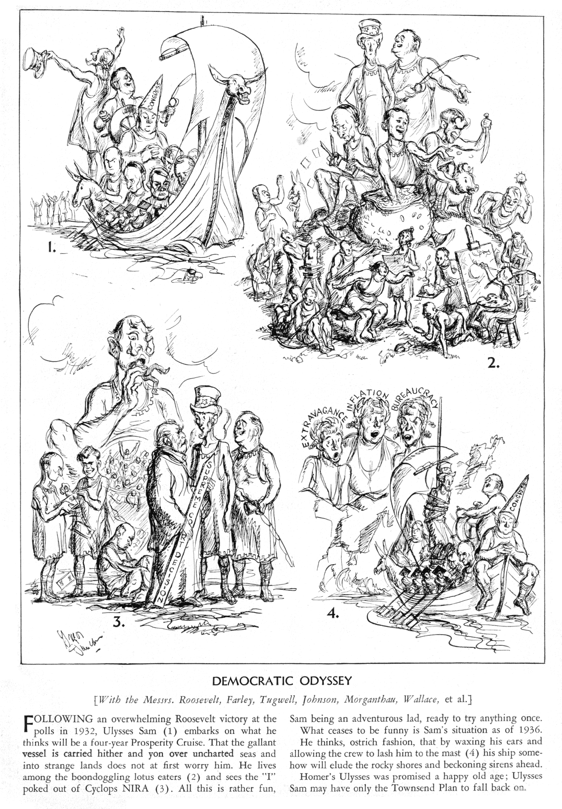 “Democratic Odyssey,” from April 1936, illustrates Duncan’s thorough-going disillusionment with the Roosevelt administration. The NIRA was the National Industrial Recovery Act of 1933, a major component of the New Deal that the Supreme Court struck down as unconstitutional in May 1935. The Townsend Plan was a proposed public pension scheme that attracted much attention prior to passage of the Social Security Act in August 1935. (As always, you may click on the cartoon for a larger version.)
