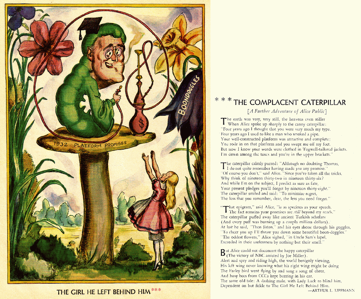In May 1936, Duncan began a series of full-color anti-Roosevelt cartoons based on Lewis Carroll’s Alice in Wonderland books. Accompanying each cartoon was a verse by Arthur L. Lippmann. The series continued until Life’s final issue in November. Reproduced below are three representative examples (to see the verses, as well, click for the larger version). The first, “A Mad Tea Party” from May, depicts “Alice Public,” together with Farley as the March Hare, Congress as the sleepy Dormouse, and Roosevelt as the Mad Hatter. The teacups on the table are labeled with the acronyms of various New Deal programs: the CCC (Civilian Conservation Corps), WPA (Works Progress Administration), TVA (Tennessee Valley Authority), and ABC (a satirical reference to the New Deal propensity to set up “alphabet agencies”).