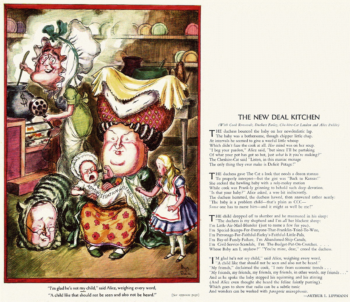 Finally, Duncan’s cartoon from September shows Roosevelt as the Cook, Farley as the Duchess, and Republican presidential candidate Alf Landon as the Cheshire Cat. The squalling infant is labeled “Administration Mistakes.”