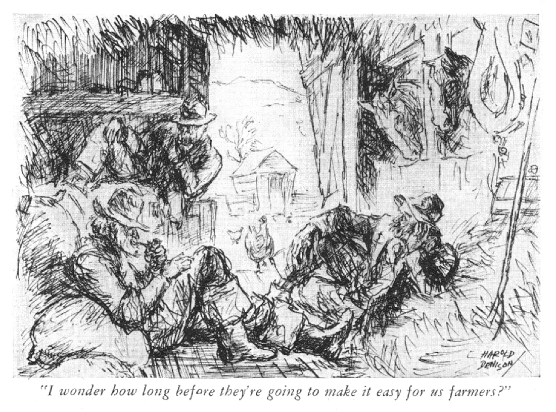 In an earlier post, I mentioned that Life tended from the beginning to ignore the agricultural depression, which was hard and deep. This cartoon by Harold Denison from March 1933 unfairly minimizes the plight of the rural sector.