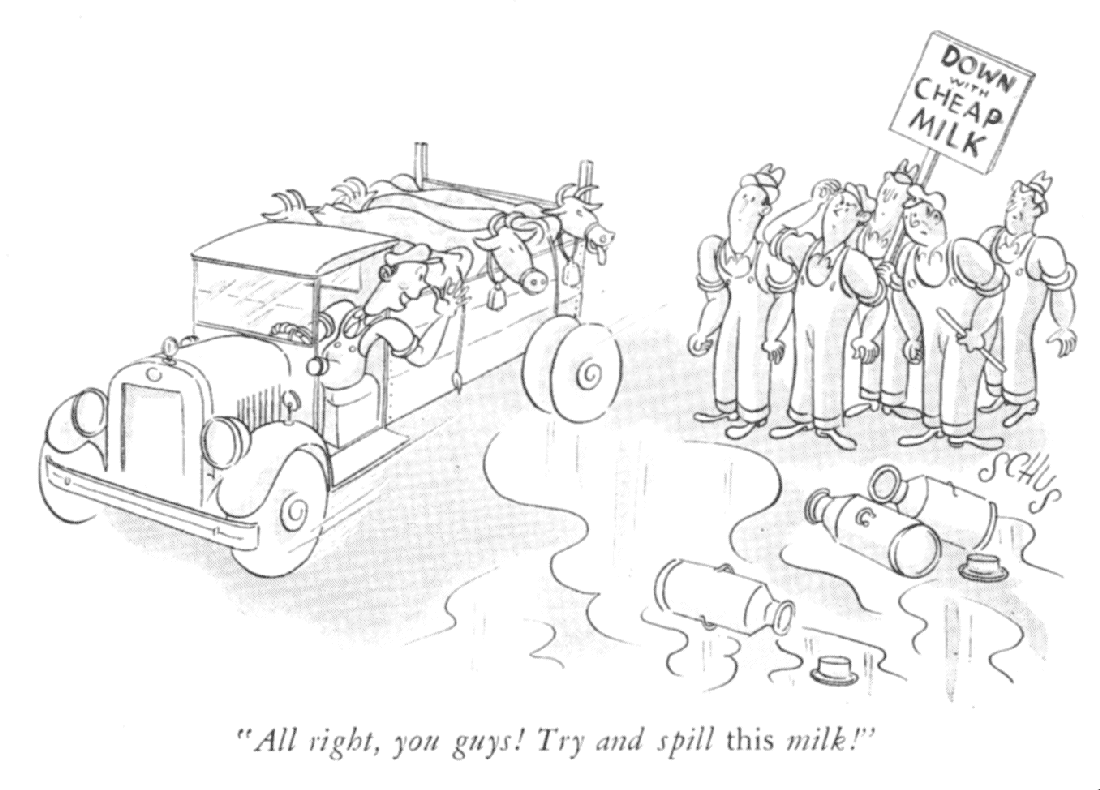 This one by Adolph Schus, from July 1933, is similarly unsympathetic to the situation of dairymen, who were protesting prices that had fallen below the cost of production.