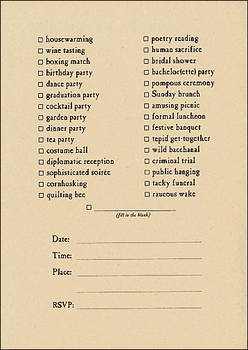 Good for anything from a prayer breakfast to a human sacrifice, this fine invitation meets every imaginable need!